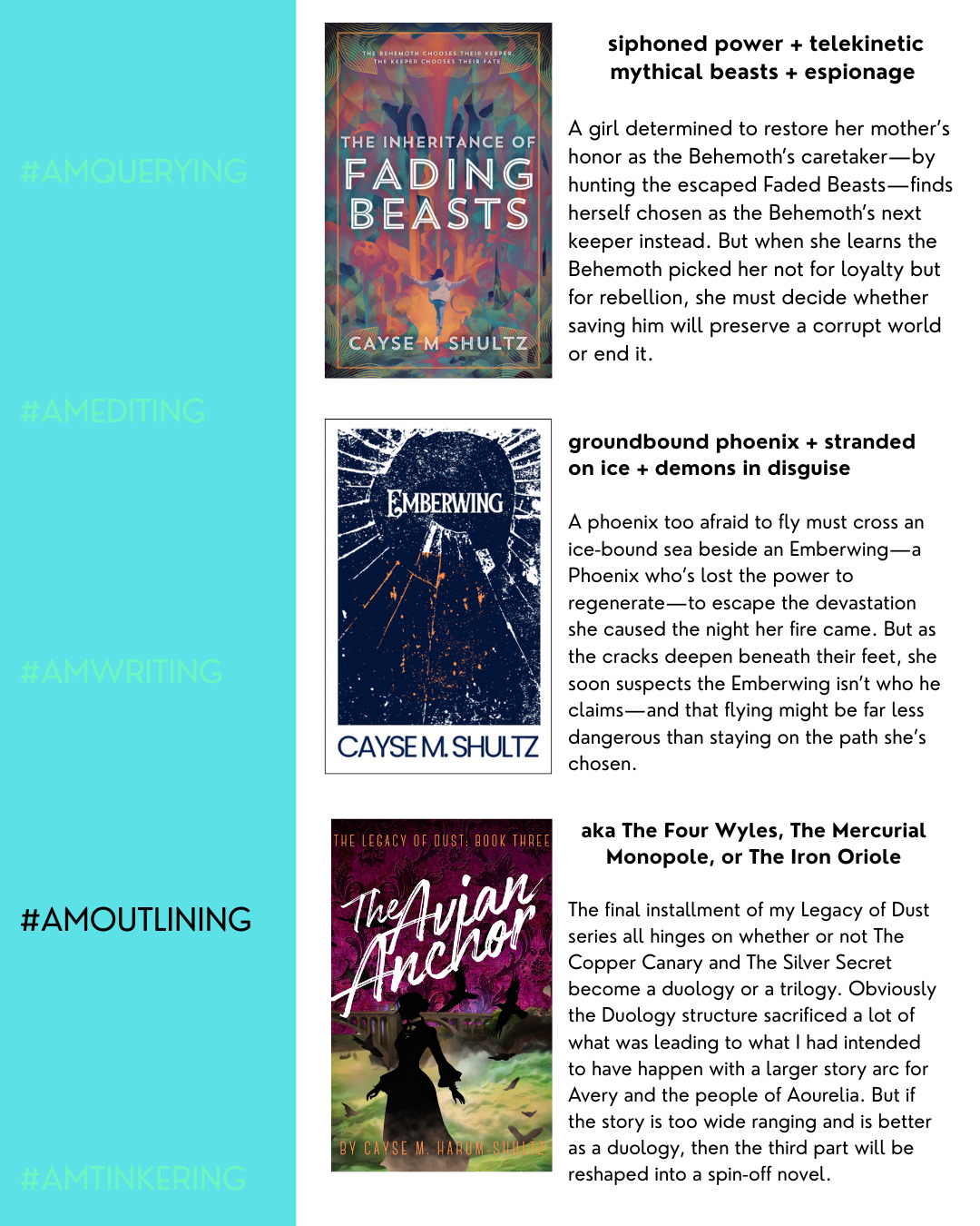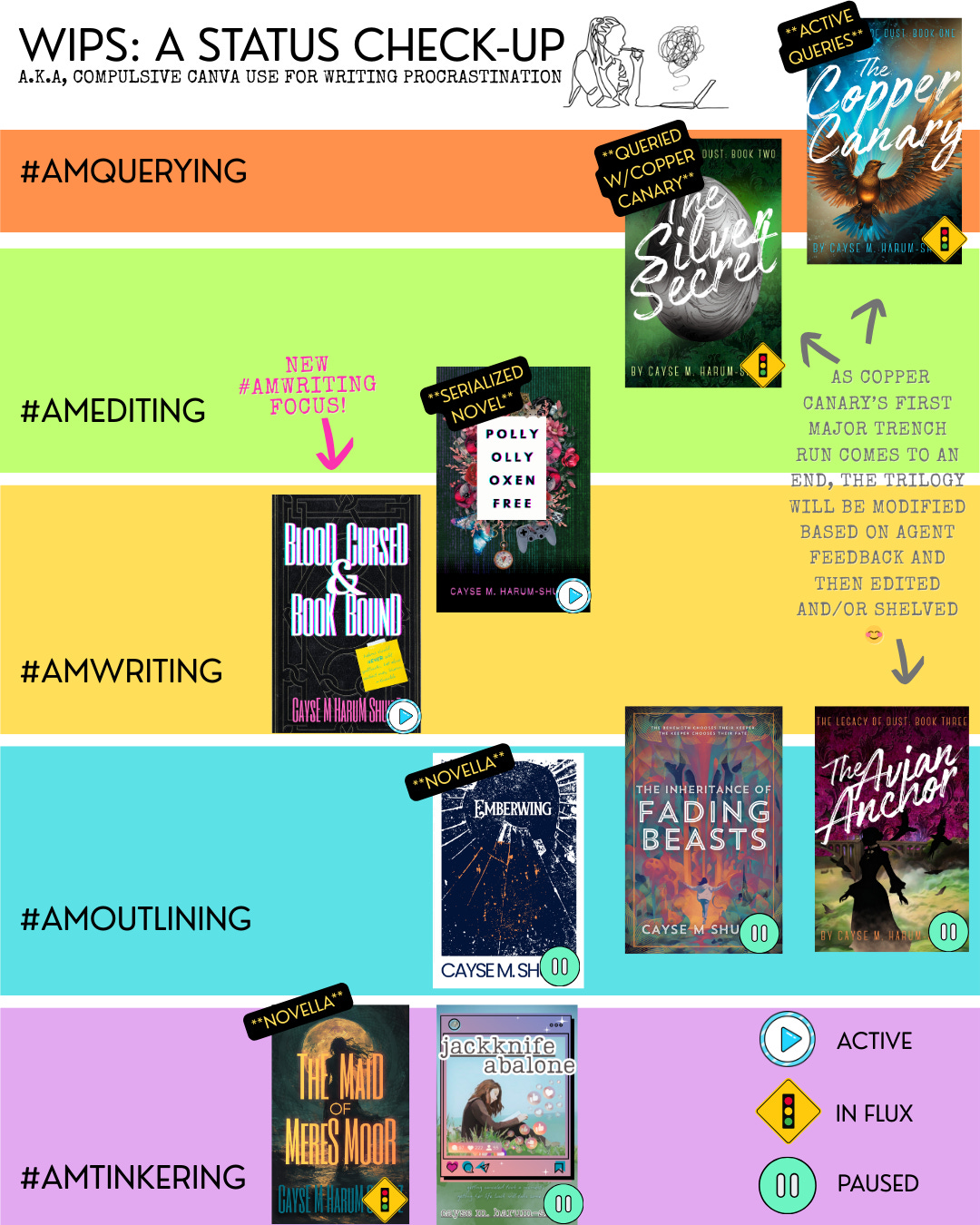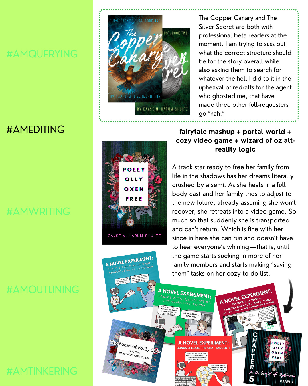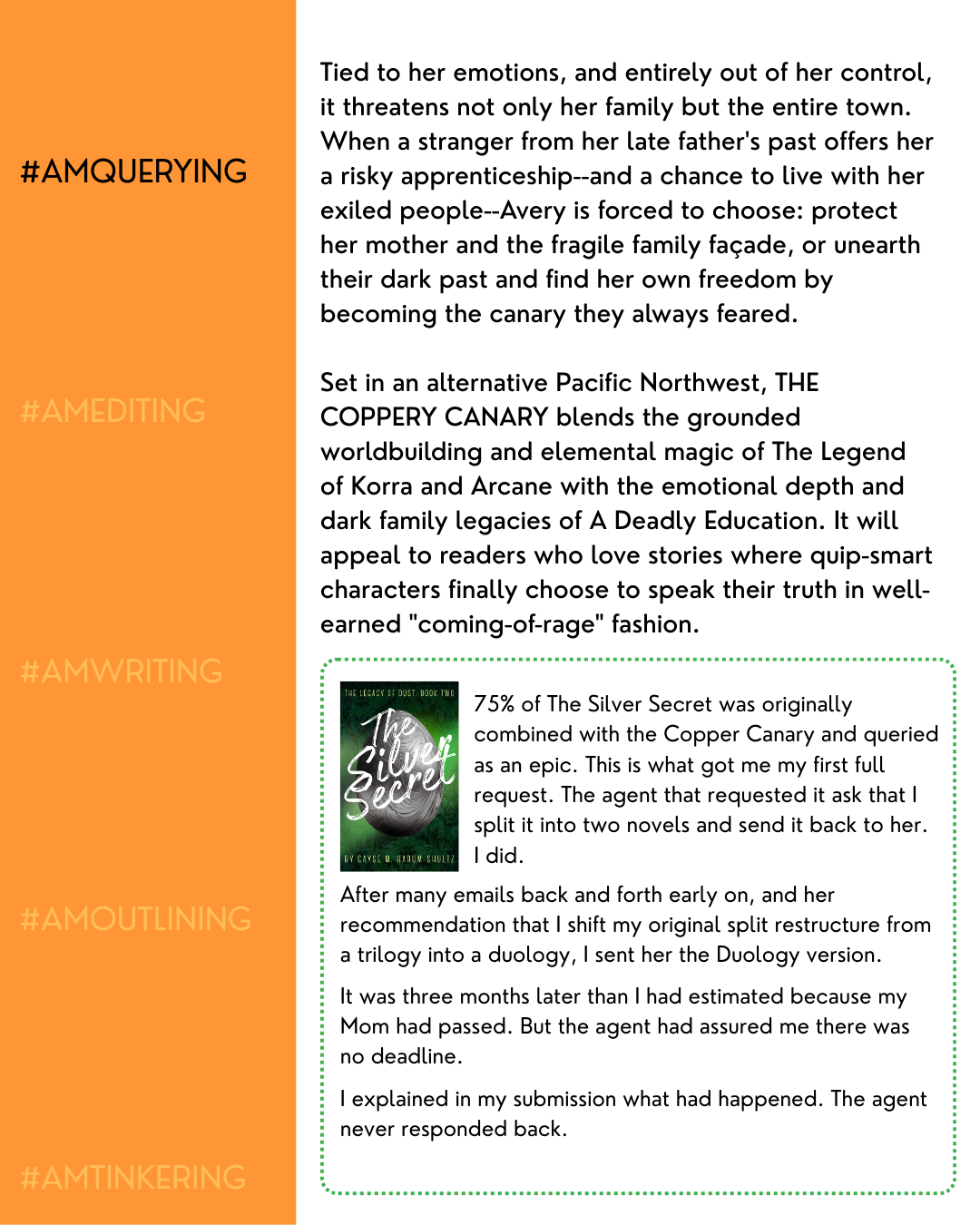 As mentioned in the image, The Copper Canary, et al. isn’t something I am giving up on. It is in professional beta reading right now. I also still haven’t heard back from six agents as of the writing of this post. So, we’ll see what happens. But for now, I am shelving it.